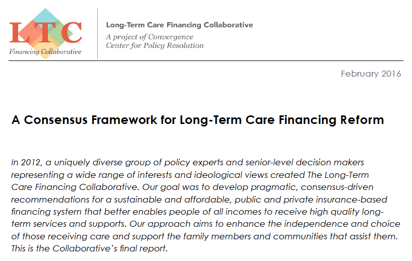 Today, the Long-Term Financing Collaborative (LTCFC) released their final report: A Consensus Framework for Long-Term Care Financing Reform. The proposals released today includes: Clear private and public roles for long-term care financing A new universal catastrophic long-term care insurance program Redefining Medicaid LTSS Encouraging private long-term care insurance initiatives Increasing retirement savings and improving public education LTCFC is a diverse … Read More
