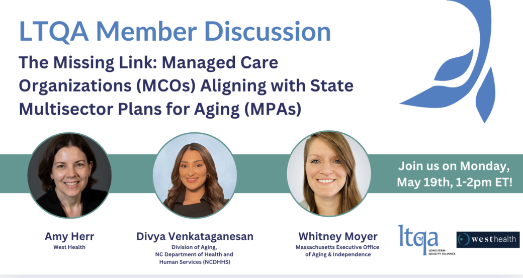 Multisector Plans for Aging (MPAs), state blueprints for action and alignment on aging initiatives, are currently being implemented or considered in more than half the states across the nation. Aims among MPAs vary based on the unique needs facing older populations in each state, yet a number of common themes exist such as physical health, housing, community/social engagement, caregiving, and transportation. To date, Managed Care Organizations (MCOs), such as Medicaid managed long-term services and supports (MLTSS) plans, have not been heavily involved in the creation nor implementation of MPAs. In February 2025, The Long-Term Quality Alliance, in partnership with West Health and the National MLTSS Health Plan Association, launched an action guide to encourage MCOs to get more involved and support state MPAs. On Monday, May 19th, we had an insightful conversation to learn more about MPAs and how MCOs can align their expertise in care coordination and service delivery with the broader objectives of state aging goals.